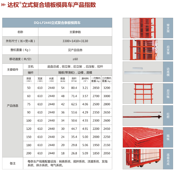 組成:底盤總成,前立架,后立架,后壓板,拉桿,隔板(帶滑輪),邊模,底模。