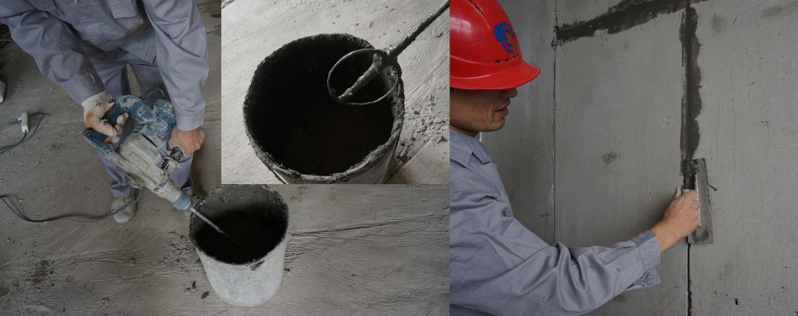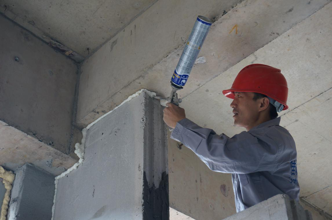 用電動(dòng)工具攪拌粘合劑,按配方均勻拌合,干濕適中,粘合劑要隨配隨用,并應(yīng)在30min內(nèi)用完。墻板與地面,與其他墻、柱接觸處涂抹粘合劑,由二人將墻體按墻體線扶正就位,一人拿撬棒,就位后,由一人在一側(cè)推擠,準(zhǔn)確對(duì)線,一人用撬棒將墻板撬起,邊撬邊擠,并通過(guò)撬棒的移動(dòng),使墻板移在線內(nèi),是粘合劑均勻填充接縫,使凹凸楔口連接緊密,互相咬合,楔口內(nèi)粘合劑飽滿(以擠出漿為宜)。