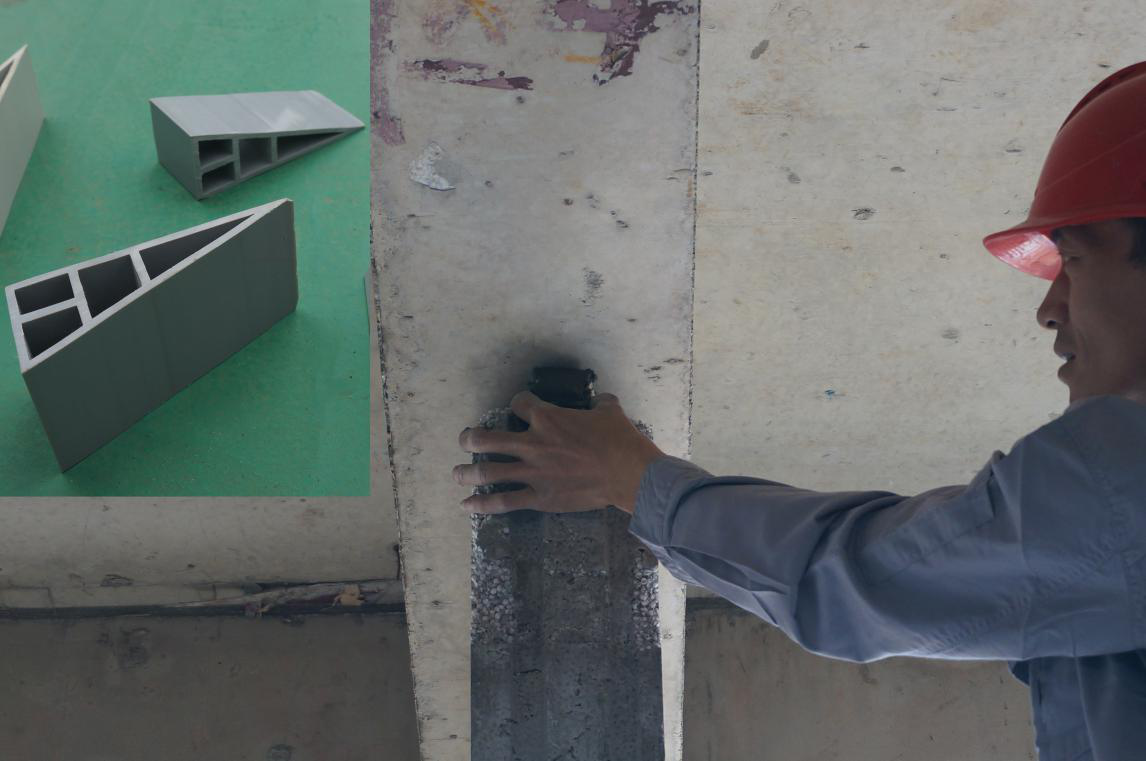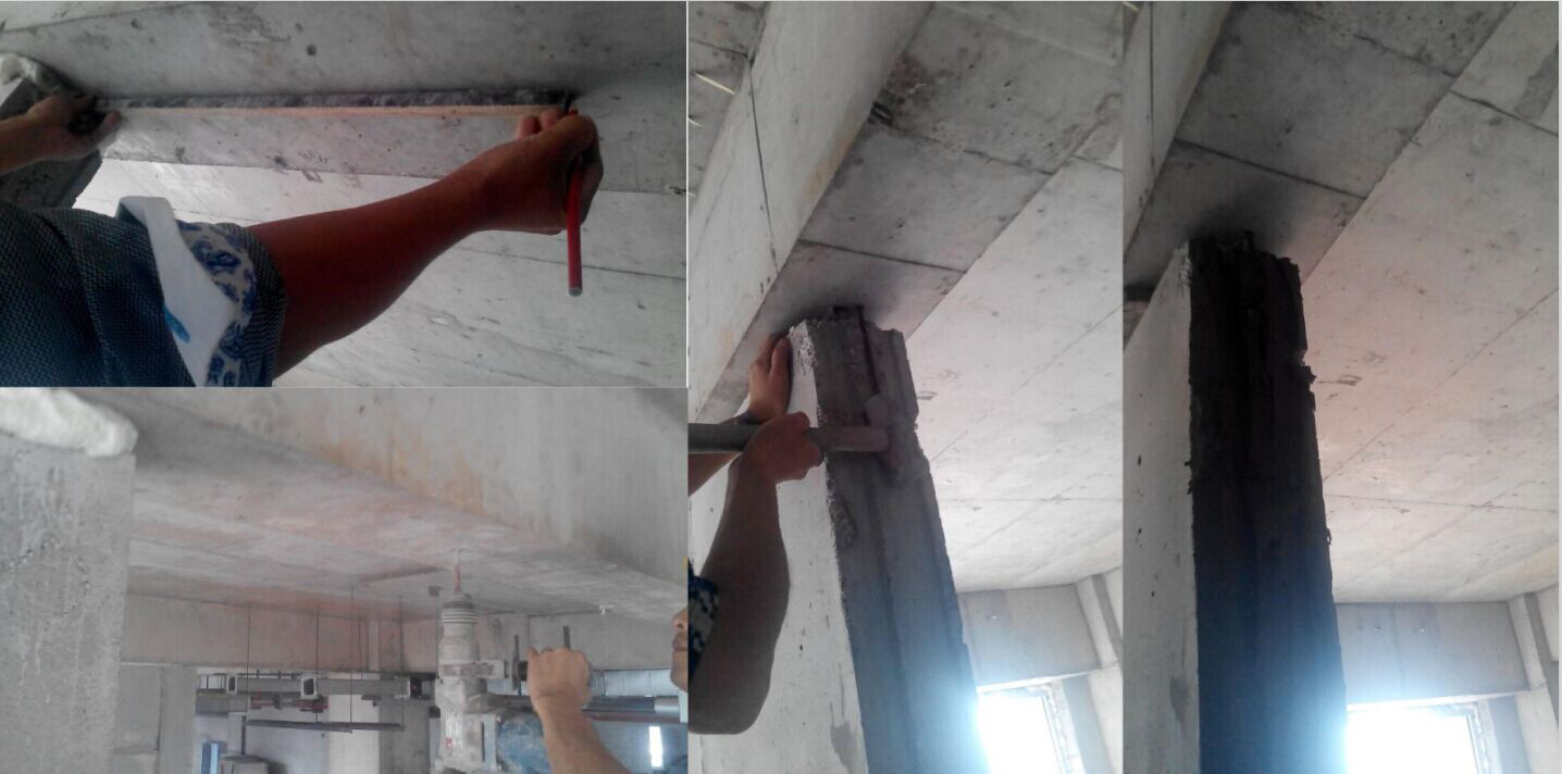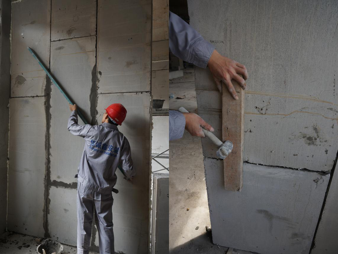 準(zhǔn)備膠楔,拿好鐵錘,待對(duì)準(zhǔn)線的時(shí)候,撬起墻板不動(dòng),用膠楔固定,鐵錘敲緊,由于墻板對(duì)線就位為粗調(diào)校,加上膠楔緊固時(shí)稍有微小錯(cuò)位,一般需要重新調(diào)校即微調(diào)(一般在5mm以?xún)?nèi)的平整度調(diào)整),板下端可通過(guò)捶打膠楔使之調(diào)整在允許偏差范圍以?xún)?nèi)。